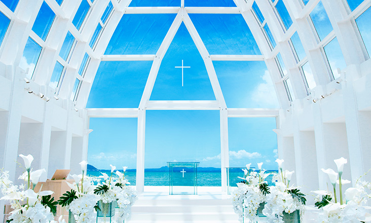 天井までガラス張りのため、空と海の青さに包まれた開放的なチャペルです。