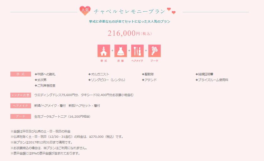 衣装込の基本挙式プランにフォトアルバム、フラワーシャワーなどもついて土日祝日でも料金は変わらないという