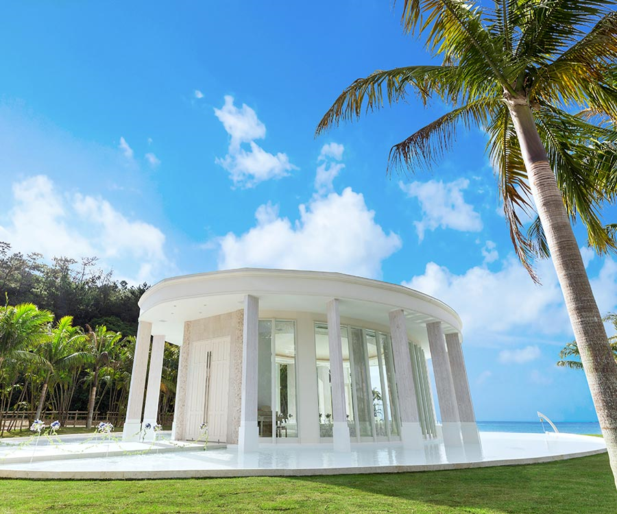 壮大な緑とキラキラと広がる青い海の中に佇む真っ白なチャペル。